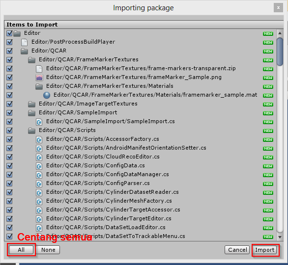Setelah di double klik maka akan muncul konfirmasi import di Unity. Centang semua elemen dan klik Import.
