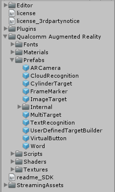 Setelah berhasil di import maka akan muncul isi dari package Vuforia SDK pada window project.