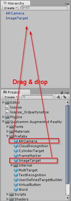 Untuk memulai membuat AR drag & drop prefab ARCamera dan ImageTarget dari window project ke window scene